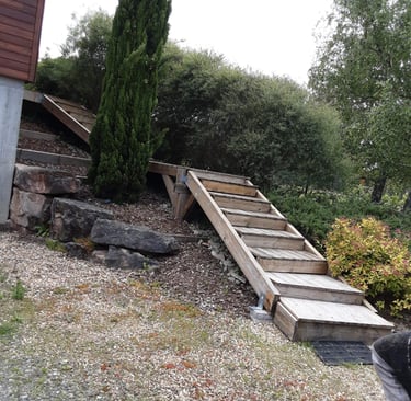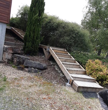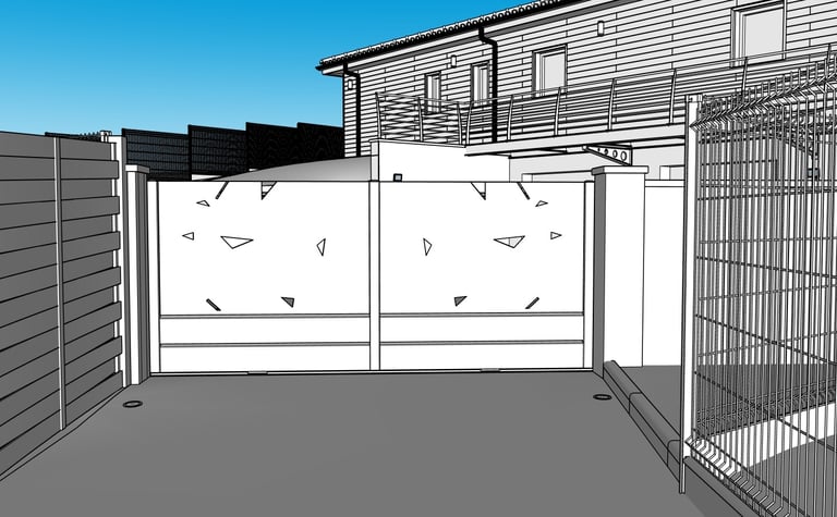 Les objectifs : Implanter un portail électrique, créer une zone carrossable devant la maison, concevoir un accès au plain-pied en voiture, remplacer l'ancien escalier en bois par une solution plus esthétique et plus durable, et relier les deux zones par un accès piéton accessible PMR.