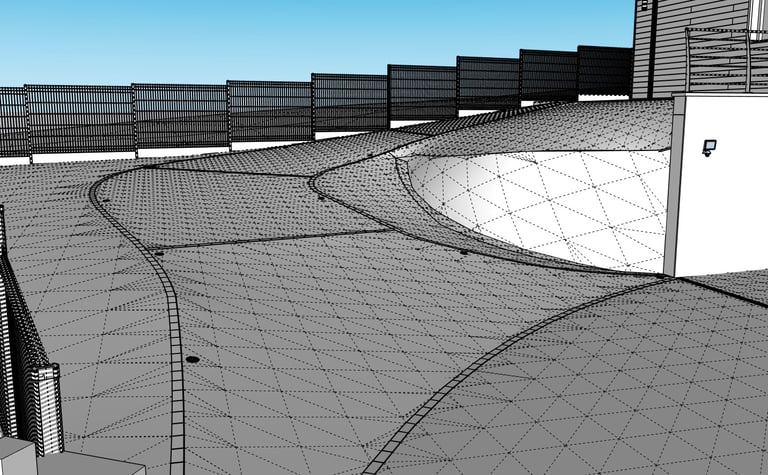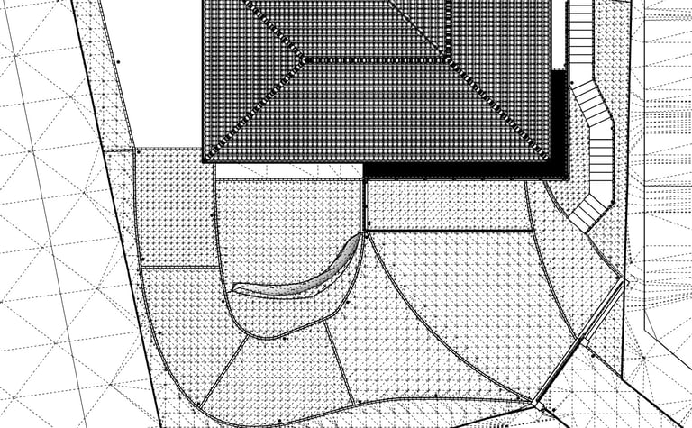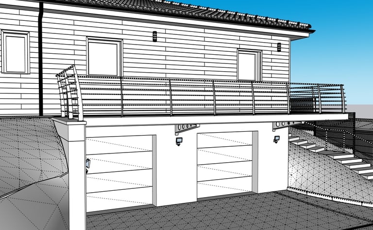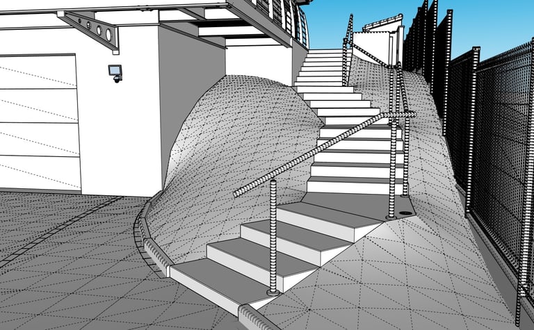 Le projet a nécessité une étude précise des pentes et niveaux pour garantir un accès fluide entre la zone carrossable, l’escalier et la porte d’entrée.