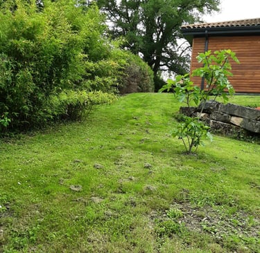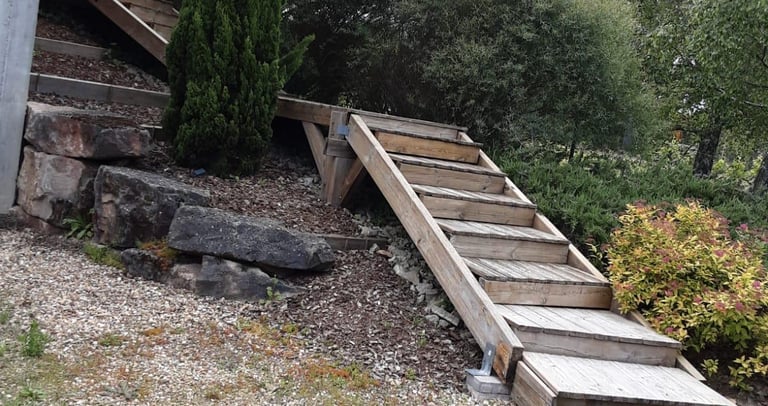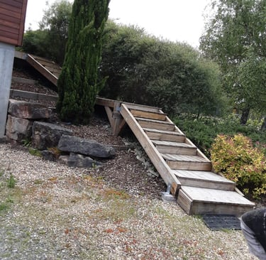 L’intervention a porté sur la création d’une zone carrossable devant la maison, intégrant un portail électrique et un accès direct au plain-pied en voiture. L’ancien escalier en bois a été remplacé par une structure plus esthétique et durable. L’accessibilité PMR a été rendue possible grâce à une passerelle métallique située sur un même niveau, longeant la façade de la maison et assurant le passage entre le haut de l’allée carrossable et l’entrée de l’habitation.