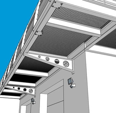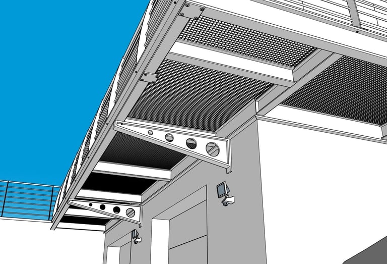 L’allée carrossable, la passerelle métallique située sur un même niveau et longeant la façade, ainsi que les cheminements et massifs paysagers ont été pensés comme un ensemble cohérent, où les contraintes techniques structurent le projet.
