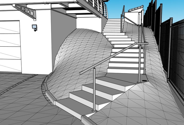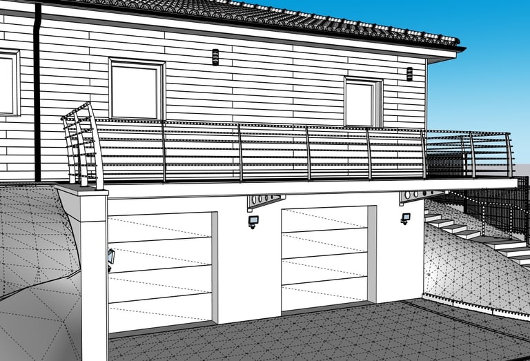 Le projet a nécessité une étude précise des pentes et des niveaux afin de garantir un accès fluide et sécurisé entre la zone carrossable, l’accès au plain-pied et l’entrée de la maison.